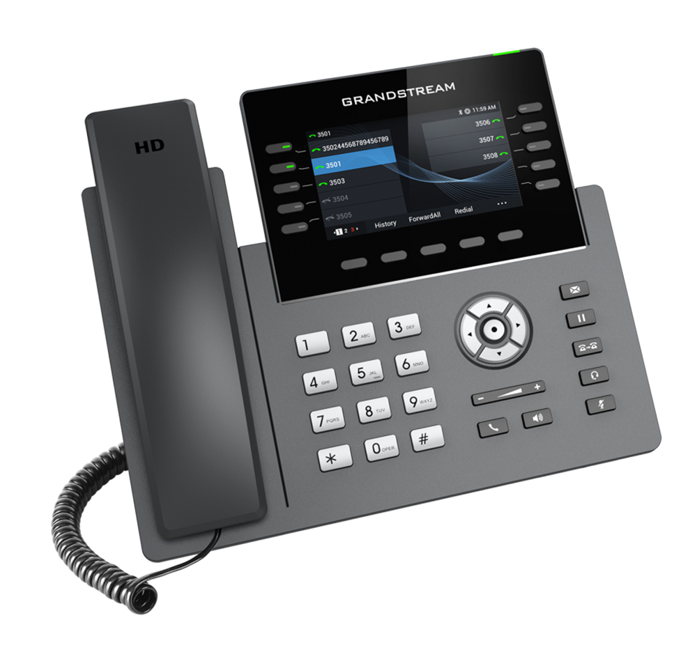 The GRP2615 features 40 multi-purpose keys (MPKs),  integrated Wi-Fi, Bluetooth support, a color LCD with swappable face plates for easy logo customization and more and is supported by Grandstream’s Device Management System (GDMS).